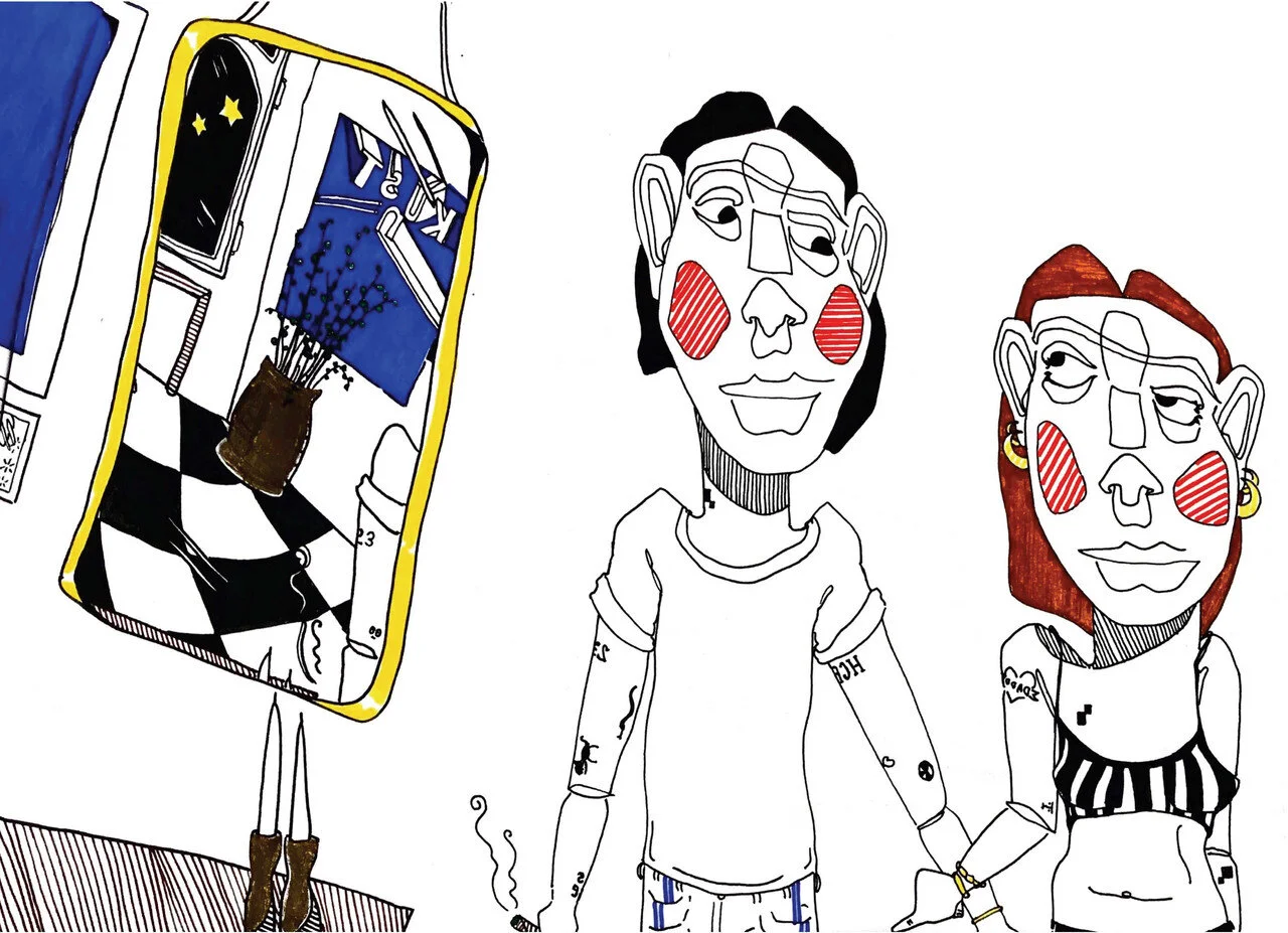 & it’s ashy warm wood slats where the floor is a wall, grief gestures in dream time, small and big places to remember you never could forget, 8x10in, ink on paper